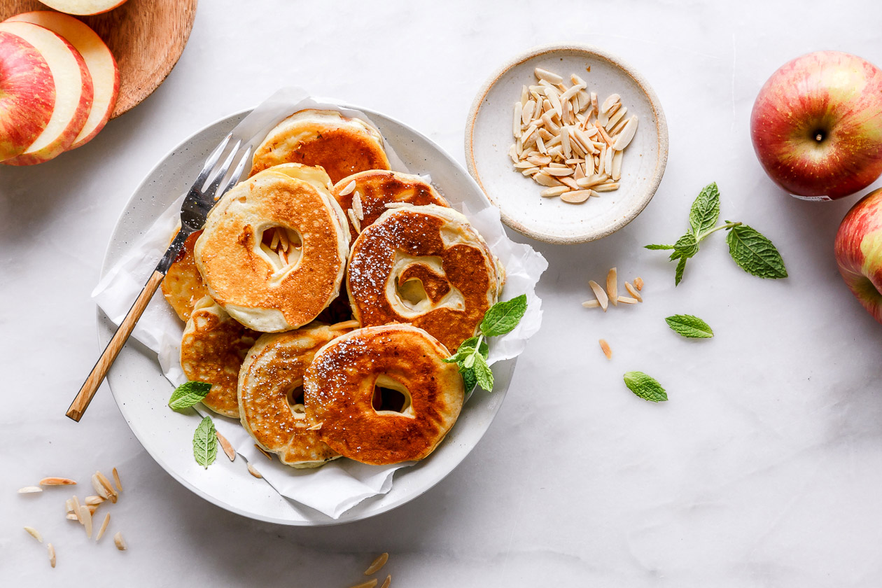 Mit etwas Joghurt und gehobelten Mandeln machen sich die gebackenen Apfelringe wunderbar als Frühstück.