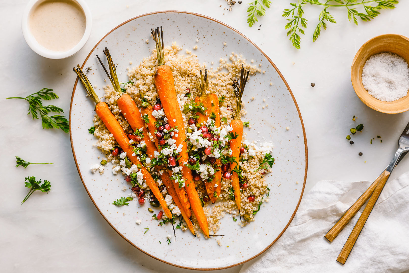 Ich finde ja, der relativ milde Geschmack von Möhren und Quinoa ergänzt sich super gut mit einem Tahini Dressing.