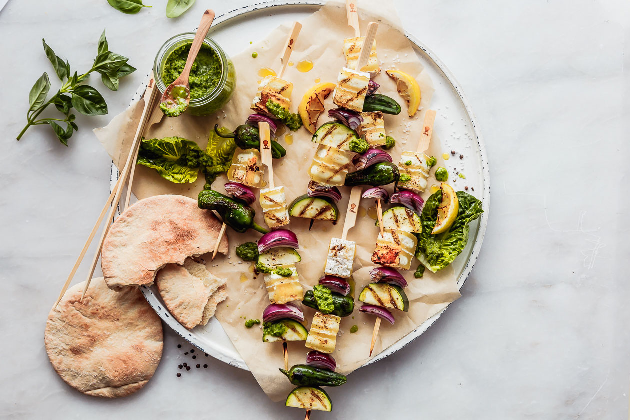 Grillspieße mit Gemüse und Sauermilchkäse